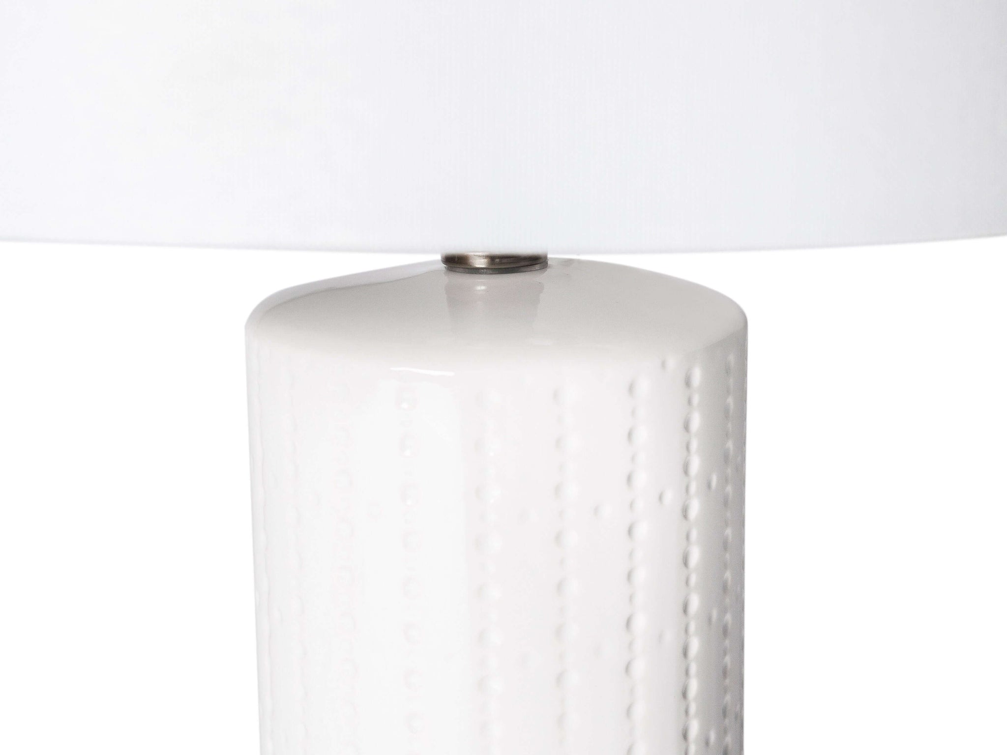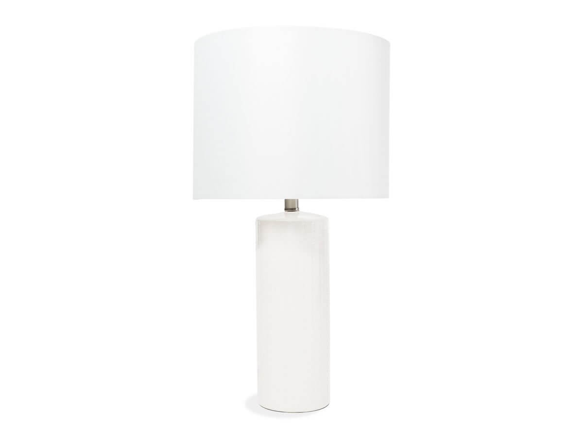 This table lamp is the perfect modern accessory for a bedroom, study room or living space. The base is made of glazed ceramic and acrylic. Topped with a fabric drum shade and 3-way switch.
