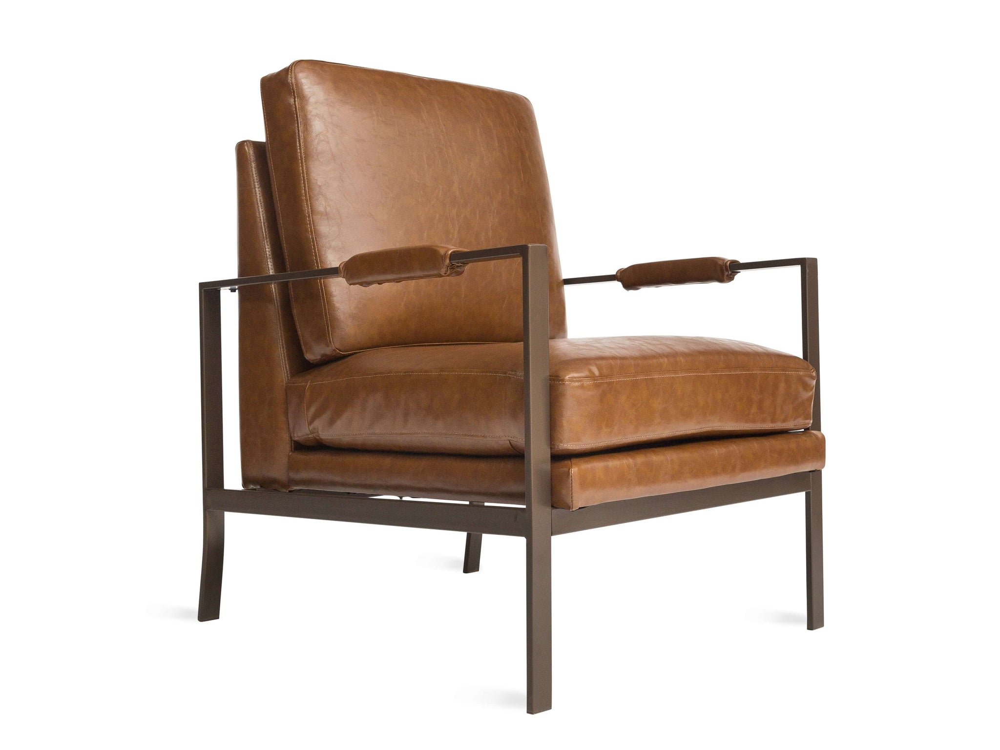 The Fleather Arm Chair has a linear exposed metal frame with an antique brass finish and box seat cushion. The seat cushion, back, and upholstery-wrapped padded armrests are made of weathered faux leather in a light brown tone.