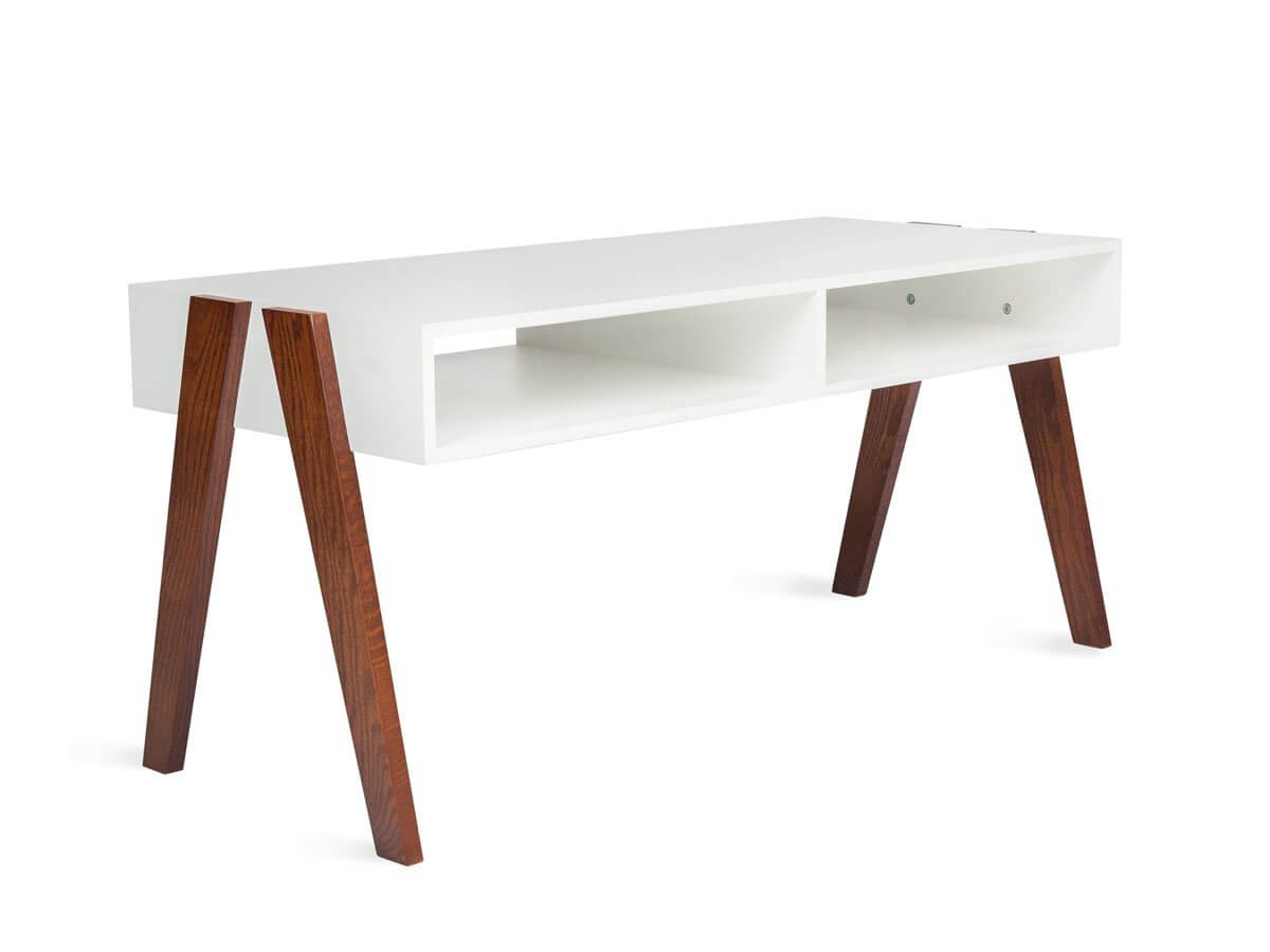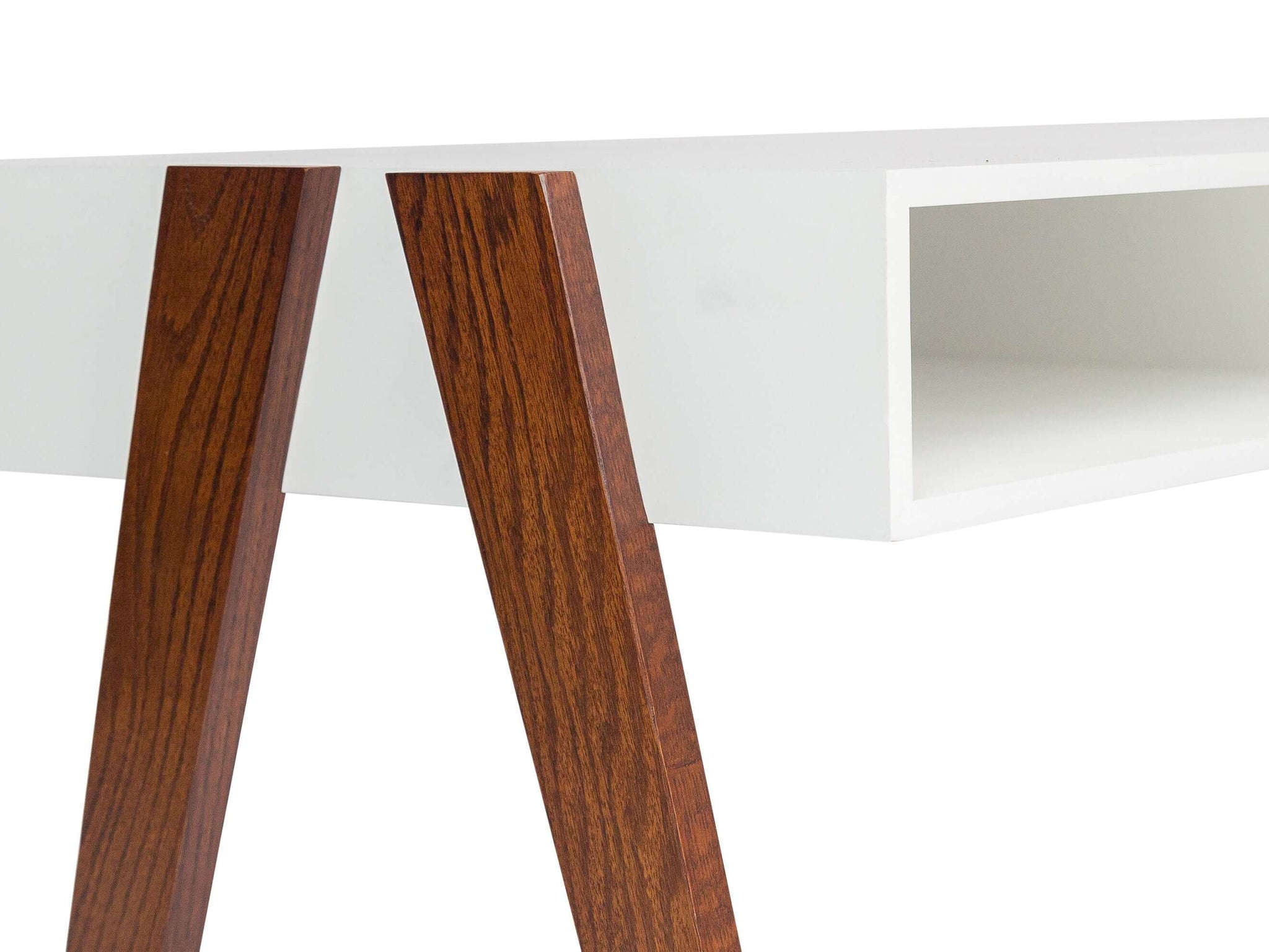 A smooth white table top is accented by oak wood legs with a rich, walnut wood grain. Two inner cubbies provides storage space for your goodies. Place this coffee table in the center of the living room for standard use, or place it under your TV where it can double as a TV stand!