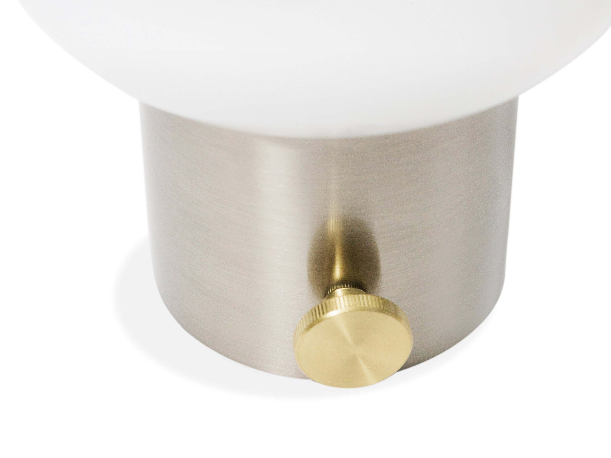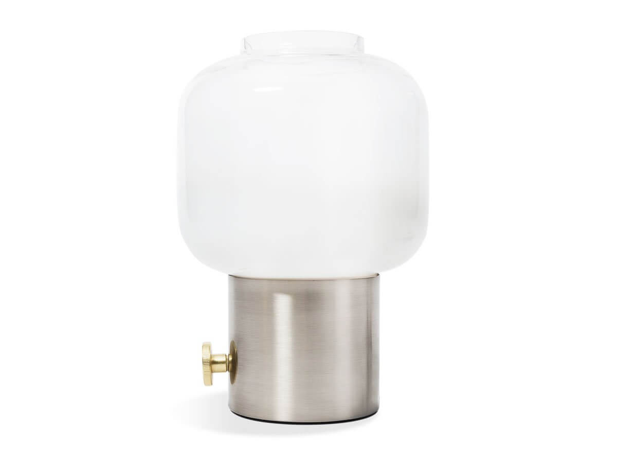 A beautiful glass shade has a white color on the bottom and fades into a clear glass on the top. A large, round knob switch on the brushed steel metal base turns the lamp on and off. With a compact silhouette, this lamp can also be a great decorative accent to a bookcase or shelf.