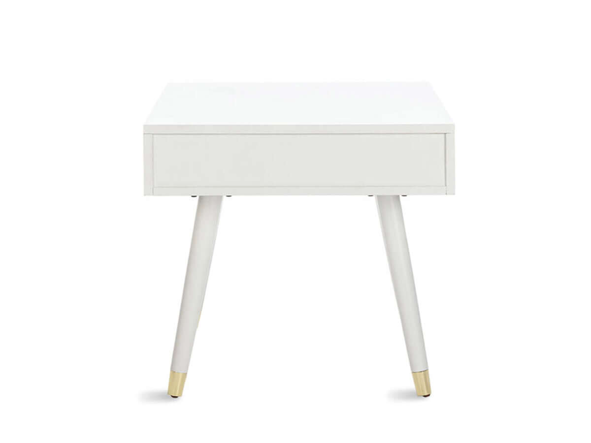 For a quick modern update to your home, the Large Polished Nightstand will add that trendy mid-century appeal. Featuring a sleek white finish, solid wood veneer, slim flared legs and recessed handle drawer pulls.