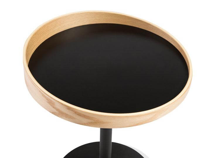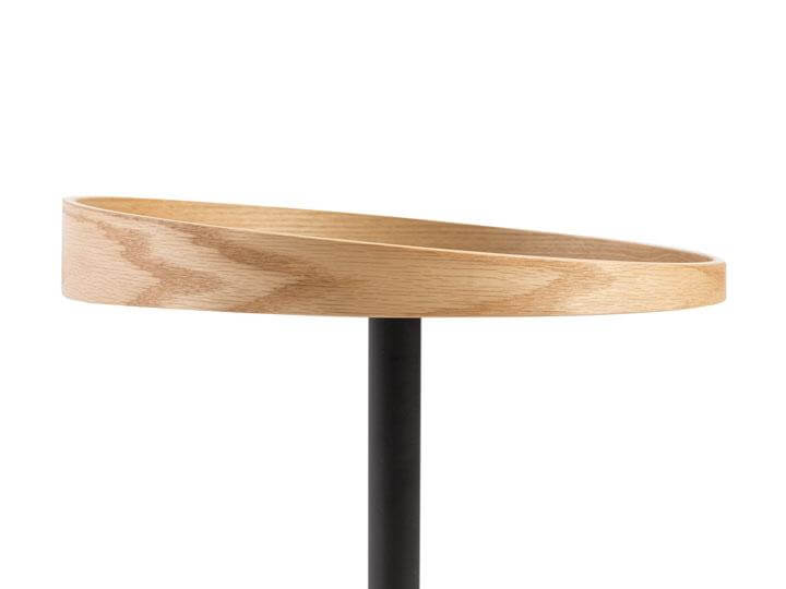 The Round Lip table features a sturdy black matte metal base, a painted black MDF table top, and a natural oak wood veneer rim. The wooden rim is uneven in height around the table top offering a unique, mid-century modern look, while providing a secure space for valuables.
