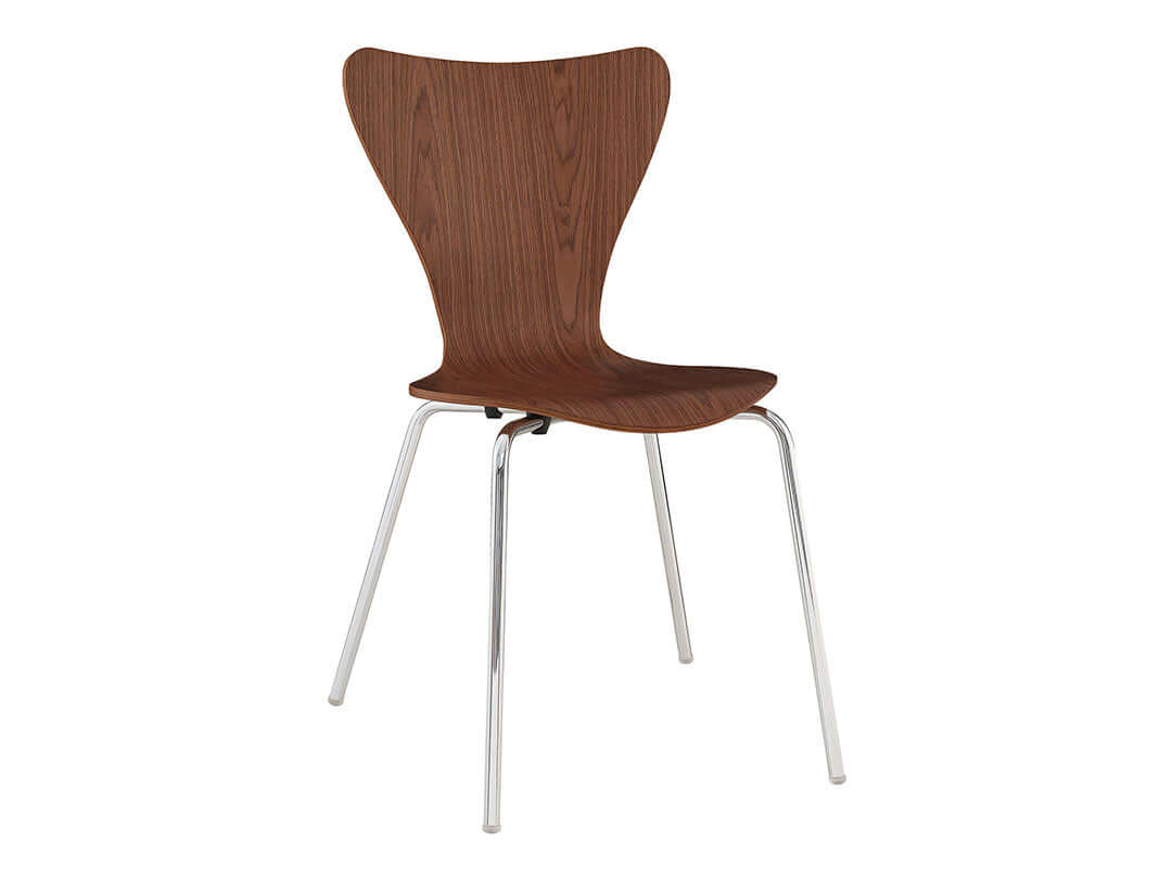 The Stacking Walnut Chair has polished chrome detail and wood grain accents to create this retro dining chair. Constructed sturdily as it sits atop sleek splayed metal legs, the solid plywood seat on this vintage modern dining chair offers supportive comfort with its waterfall edge and winged backrest.
