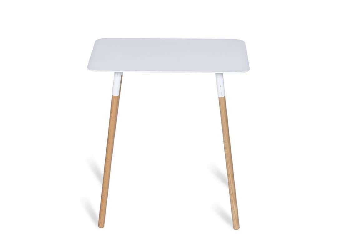 A simple, modern rectangular side table uniting form and function. Features a low maintenance, coated-steel tabletop on a base of slim wooden legs.