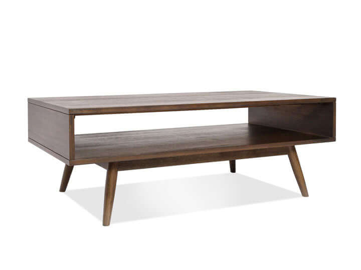 The Wood Storage Table has a natural wood color finish in a simple silhouette modern aesthetic. Crafted of veneers, wood, and engineered wood in a dark brown finish. A mid-century minimalist vibe with its canted legs.